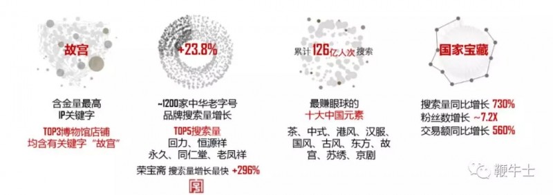 阿里研究院5月发布的《2019 中国消费品牌发展报告》数据显示,截至报告发布前,阿里电商平台上的中式、汉服、苏绣、故宫、国风等中国元素的搜索累计达到了126亿人次。