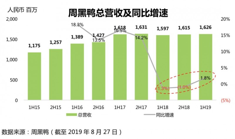 8月27日晚,周黑鸭(1458,HK)发布2019年半年报,数据显示,2019年上半年,公司实现总收入16.26亿元,较上年同期增长1.8%,相比去年的萎缩状态,今年上半年公司在营收规模上重回增长轨道。具体来看,鸭及鸭副产品实现收入14.20亿元,占比87.3%;卤制蔬菜等其他产品实现收入2.06亿元,占比12.7%。