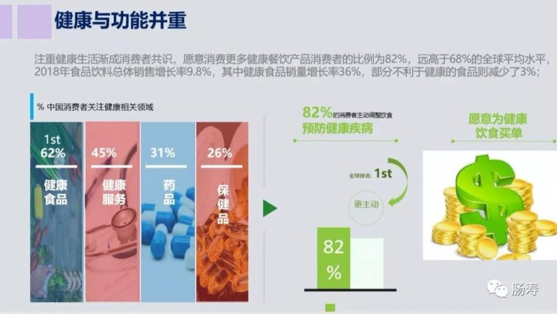 接着我们来看一组数据,就是健康与功能并重,那么经过市场的调研,中国的消费者,他关注的健康相关领域呢,26%是保健品,31%是药品。45%是健康服务。那么位列第一位的是占了62%的健康食品。