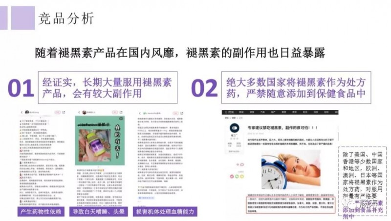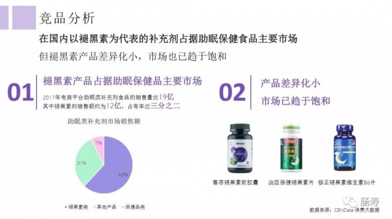 那么同时呢,我们又对竞争产品做了一个分析,那么目前在国内已褪黑素为代表的补充剂占据助眠保健食品的主要的市场,但是褪黑素的产品呢,差异化小市场已经趋于饱和。