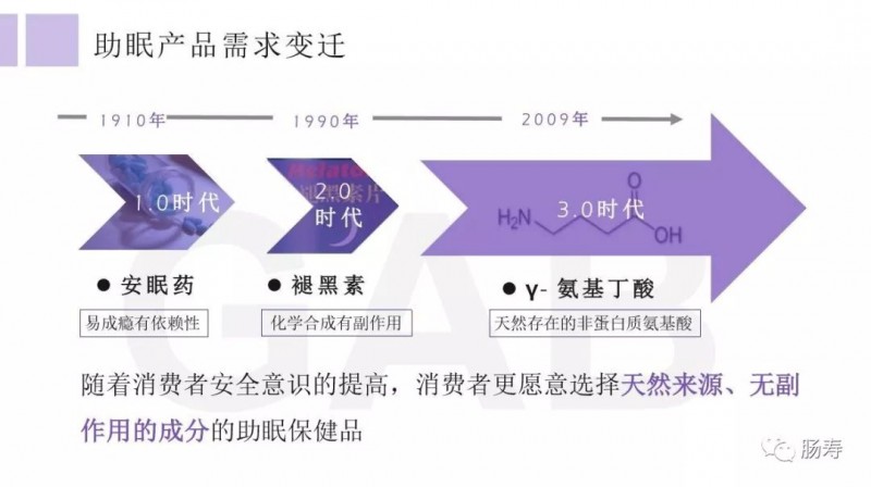 所以在整个助眠产品的需求的变迁当中呢,在1.0的时代,就是安眠药,那么安眠药呢,他易成瘾有依赖性,在2.0时代的时候呢,是褪黑素,那么褪黑素呢,是由化学合成的,有副作用,那么3.0的时代就是我们的蒙牛晚上好,那么蒙牛晚上好,它主要的成分就是叫GABA。那么专业的术语叫氨基丁酸,它是天然存在的非。蛋白质,氨基酸。