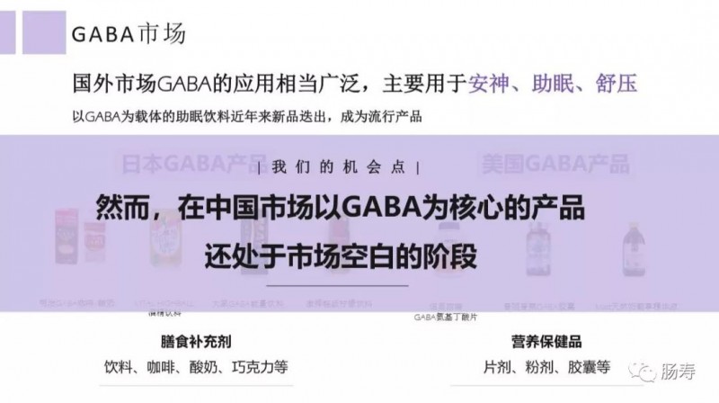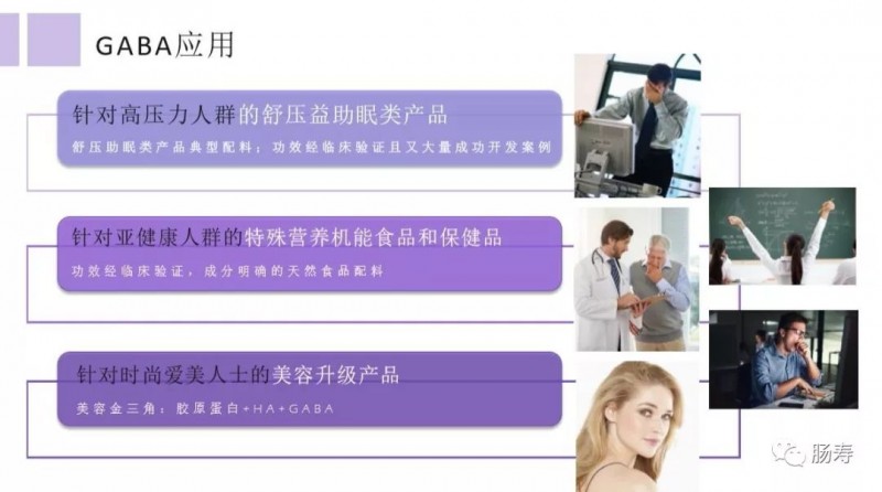 那么所以说GABA呢,他的应用主要针对高压力人群。比如说生活压力大,饮食起居比较混乱,那么这些人群呢,都是非常适用的,那么同时他又适用于亚健康人群,作为一个特殊的营养机能的食品,通过后天的补充去调理我们的身体。