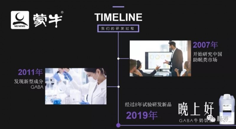 那么蒙牛晚上好呢,是历时十年研发 蒙牛集团的研发团队。那么在2007年就开始研究中国的助眠类的市场,在2011年发现了新型成分的GABA。那么准确的讲是通过八年实验研发新品,2019年隆重推出蒙牛集团的黑科技产品,晚上好,GABA牛奶饮品。