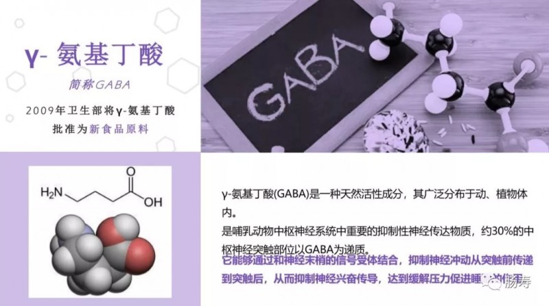 那么γ-氨基丁酸呢,它简称为GABA,从专业的术语叫氨基丁酸,在2009年,我们国家卫生部,就将嘎巴批准为新食品的原料。那么嘎巴呢,是一种天然的活性的成份。其广泛分布于动植物体内,是哺乳动物中 中枢神经系统重要的抑制性神经传达物质,约30%的中枢神经,突出部位,以GABA为递质。他能够通过和神经末梢的信号受体结合,抑制神经冲动,从突出前传递到突触后,从而抑制神经兴奋传导。那么从而呢,达到缓解压力,促进睡眠的作用。