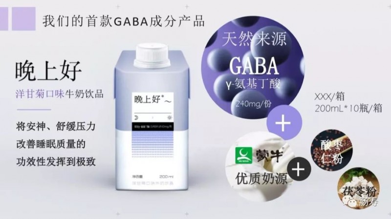 那么我们蒙牛晚上好,它主要的成分就是GABA。那么GABA呢,在国外市场广泛应用,主要用于安神,助眠,输呀。那么以嘎嘎为宅体的著名饮料呢,近年来,新品新品迭出成为流行产品。