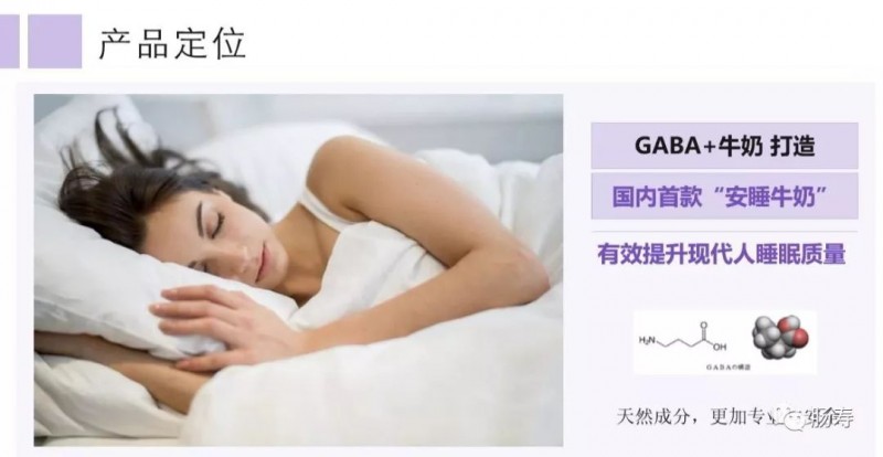 所以呢,蒙牛集团,就推出了中国首款GABA成分的牛奶饮品,那么,我们才所采取的是洋甘菊口味的牛奶饮品,相对清淡,非常低的去刺激我们的脑神经,让我们的脑神经呢逐步的安静下来,进入到睡眠状态。那么它将安神舒缓压力,改善睡眠质量,这个发挥到了极致。