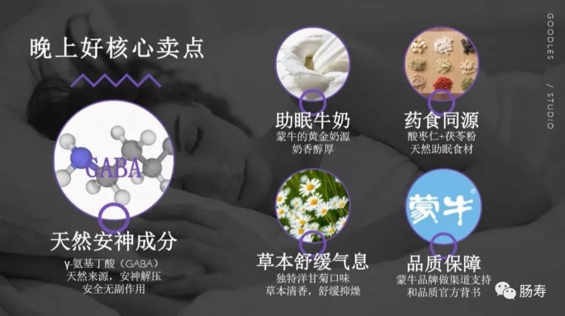 那么第二个核心的卖点是助眠牛奶,蒙牛集团用的是黄金奶源,奶香醇厚