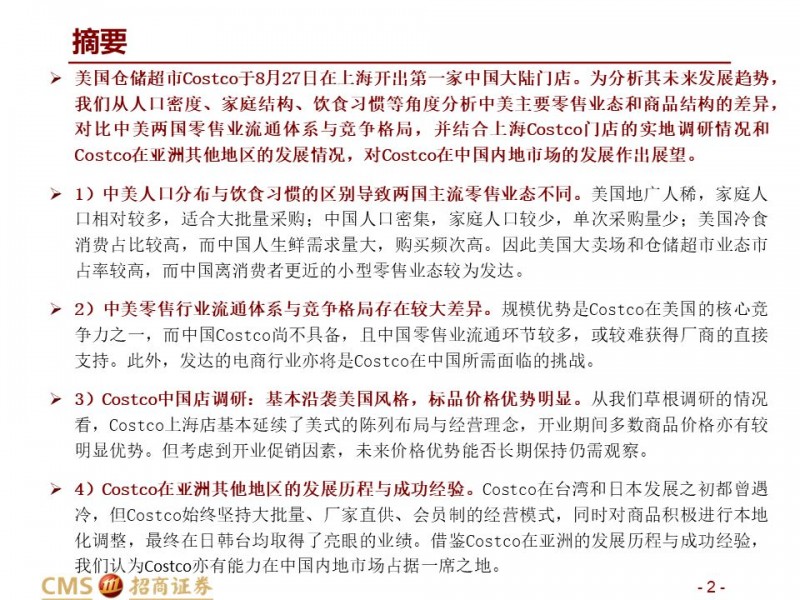 美国仓储超市Costco于8月27日在上海开出第一家中国大陆门店。为分析其未来发展趋势,我们从人口密度、家庭结构、饮食习惯等角度分析中美主要零售业态和商品结构的差异,对比中美两国零售业流通体系与竞争格局,并结合上海Costco门店的实地调研情况和Costco在亚洲其他地区的发展情况,对Costco在中国内地市场的发展作出展望。