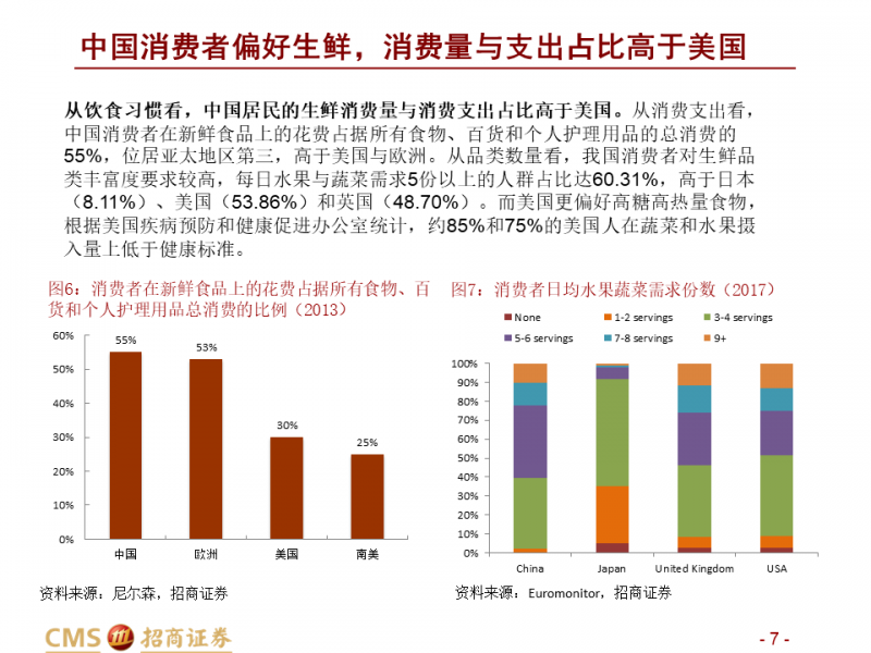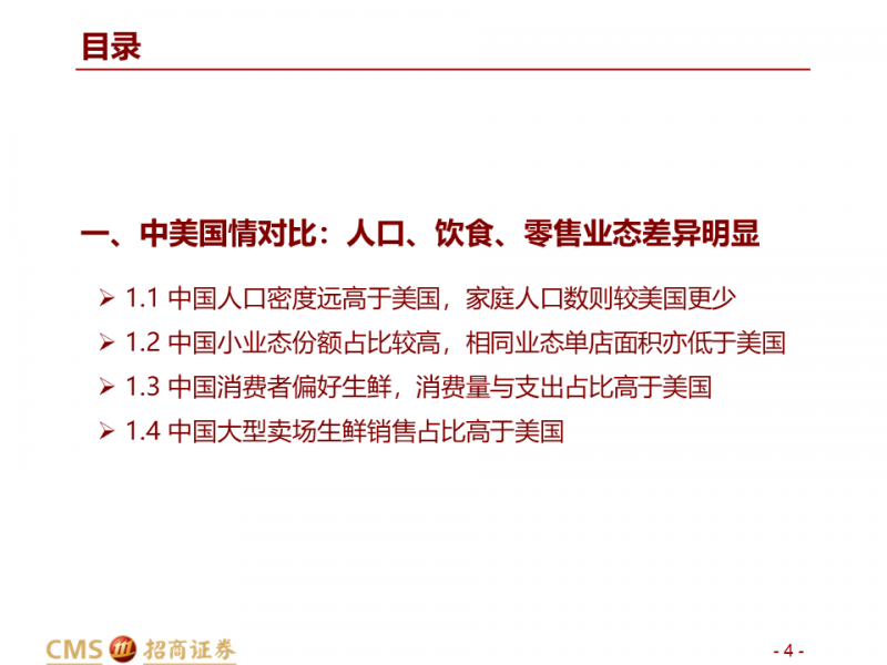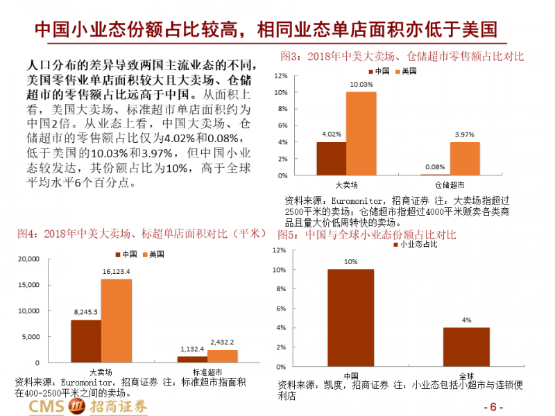 中美人口分布与饮食习惯的区别导致两国主流零售业态不同。美国地广人稀,家庭人口相对较多,适合大批量采购;中国人口密集,家庭人口较少,单次采购量少;美国冷食消费占比较高,而中国人生鲜需求量大,购买频次高。因此美国大卖场和仓储超市业态市占率较高,而中国离消费者更近的小型零售业态较为发达。