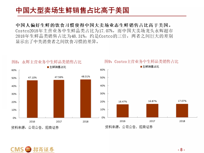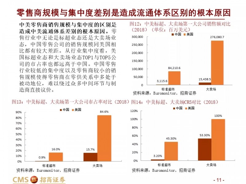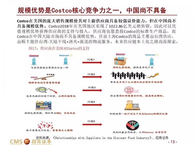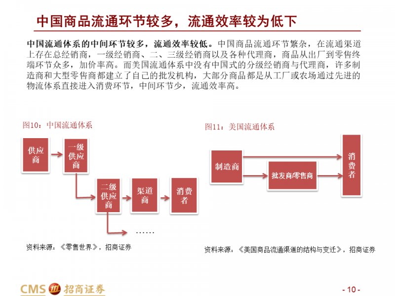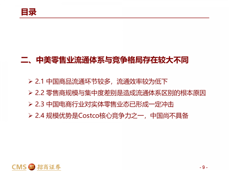 中美零售行业流通体系与竞争格局存在较大差异。规模优势是Costco在美国的核心竞争力之一,而中国Costco尚不具备,且中国零售业流通环节较多,或较难获得品牌商的直接支持。此外,发达的电商行业亦将是Costco在中国所需面临的挑战。