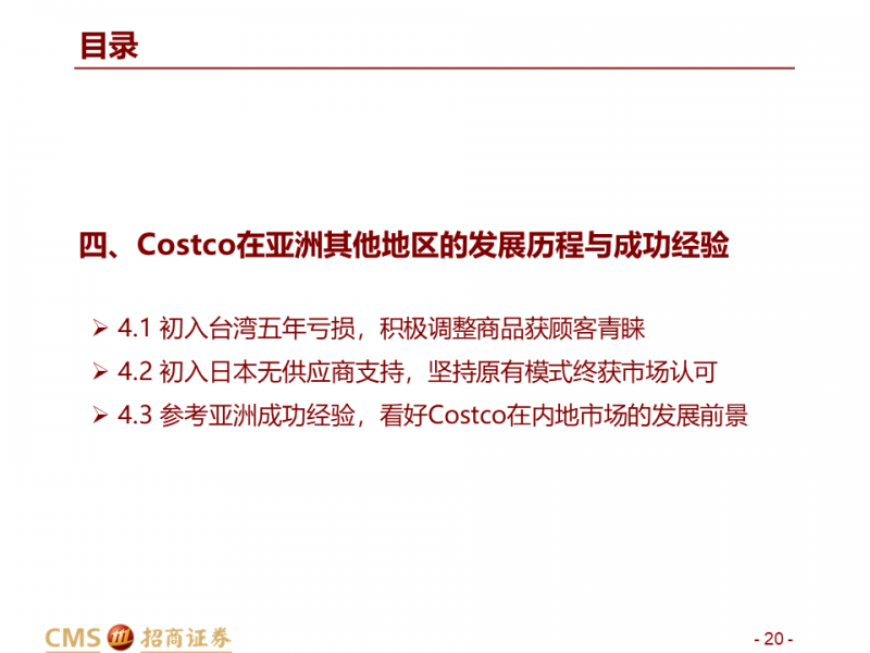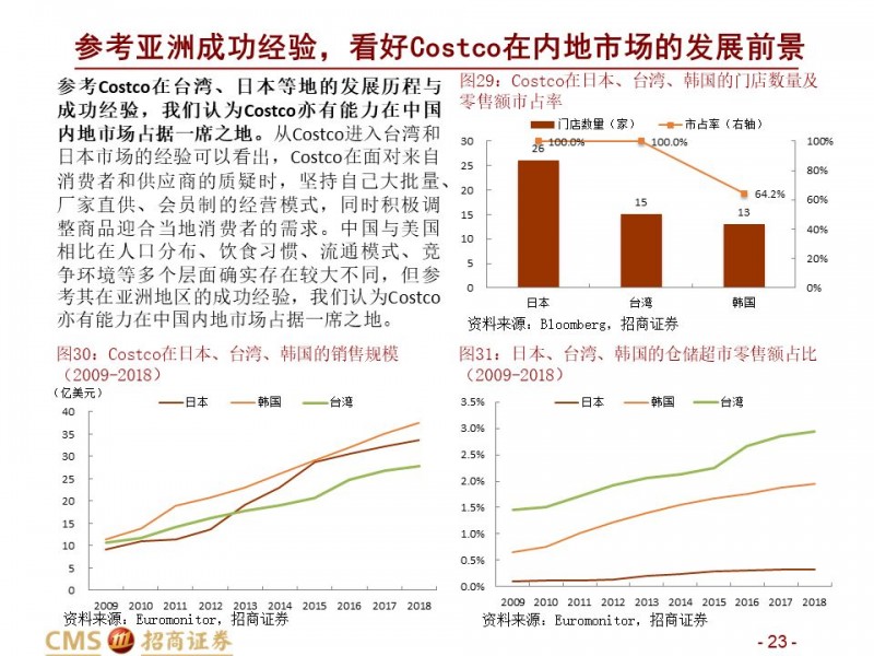 Costco在亚洲其他地区的发展历程与成功经验。Costco在台湾和日本发展之初都曾遇冷,但Costco始终坚持大批量、厂家直供、会员制的经营模式,同时对商品积极进行本地化调整,最终在日韩台均取得了亮眼的业绩。借鉴Costco在亚洲的发展历程与成功经验,我们认为Costco亦有能力在中国内地市场占据一席之地。
