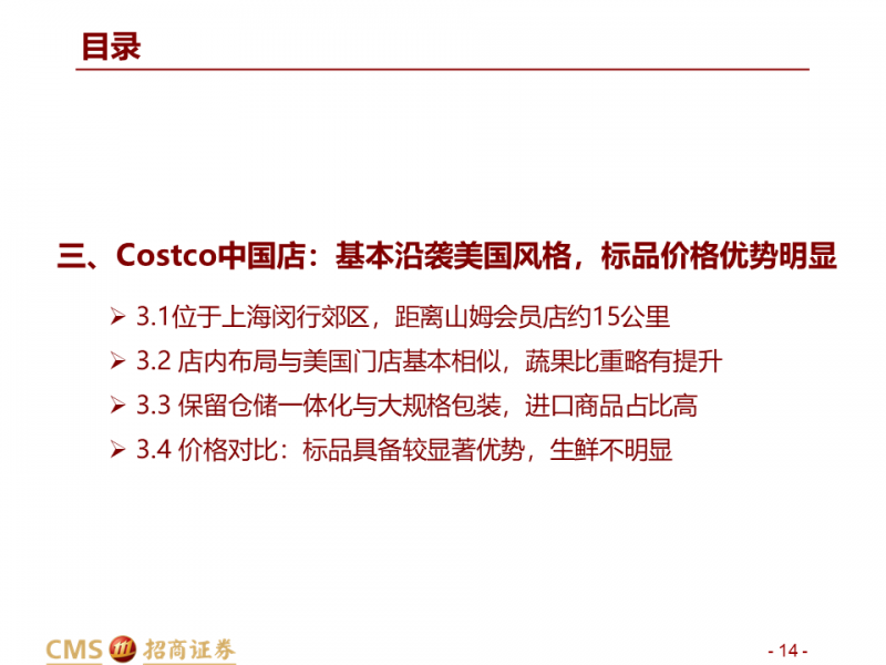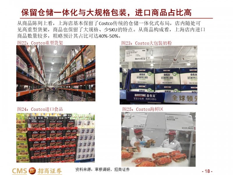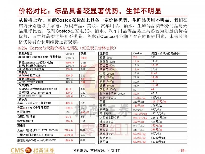 Costco中国店调研:基本沿袭美国风格,标品价格优势明显。从我们草根调研的情况看,Costco上海店基本延续了美式的陈列布局与经营理念,开业期间多数商品价格亦有较明显优势。但考虑到开业促销因素,未来价格优势能否长期保持仍需观察。