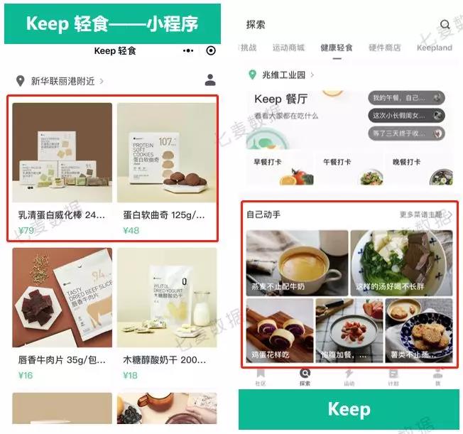 今年 3 月底,Keep 突然在微信当中上线了一款小程序 “Keep 轻食”,小程序当中有无糖低脂的食品,也有标明卡路里的沙拉,同时 Keep 也将在 4 月开启北京五环以内开始当日达或次日达的轻食配送服务。但其实早在 2017 年,Keep 就已经在自身产品当中推出轻食菜谱,让用户在跟随健身教练锻炼身体之余,也能结合饮食来保持身体,当时也引发起一些用户的感叹 “Keep 居然还能教人做菜了”。