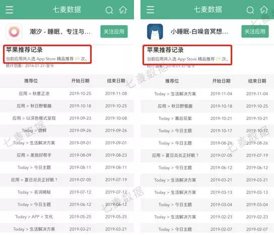 深夜无困意、12 点后仍睡不着、容易半夜惊醒等失眠问题,也是困扰着亚健康人群的一大难题。在这种情况下,以助眠曲、睡眠故事,以及睡眠数据监测为主,达到降低用户失眠,提高用户睡眠质量的目的小睡眠,也是获得了大批用户的喜爱。虽然小睡眠是在 2017 年 1 月才上架 App Store,但其也凭借功能有创意,贴近用户生活而获得苹果精品推荐 29 次。此外助眠 App 潮汐被推荐 49 次。