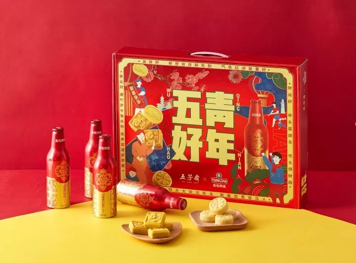 还有联合五芳斋与青岛啤酒这两个品牌进行跨界,推出了一款祝大家吃好、喝好、玩好、睡好、长得好的「五好青年」礼盒。