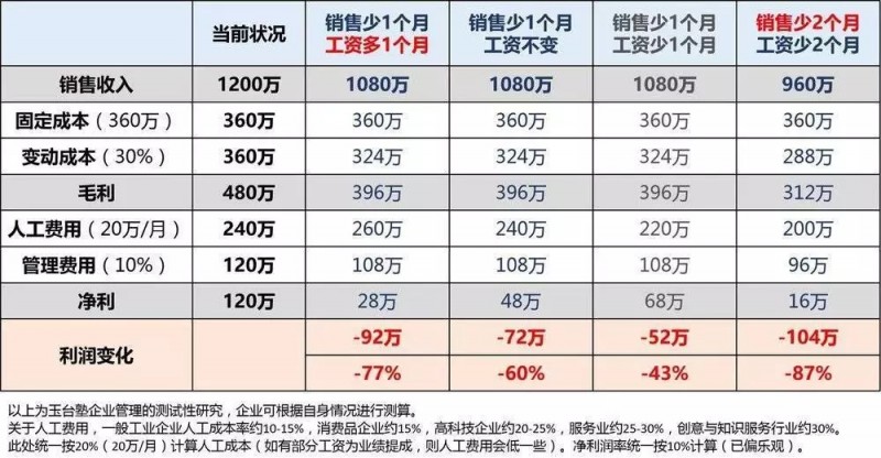 玉台塾还做了一个微观的小测试,对中小微企业而言,销售一旦下滑,对利润影响非常大(见下图)。如果有关部门还再出什么双倍工资的政策,就是雪上加霜。