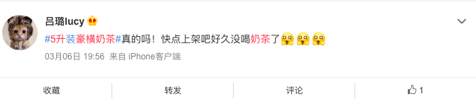 正是在店主自发朋友圈的小范围测试中,豪横奶茶走红了,各大社交媒体也在疯传那张黄色的宣传图(甚至还不是最终版),更有网友抛出了:“5升桶的奶茶到底是不是真的?哪里有卖啊?”等等这样的问题。