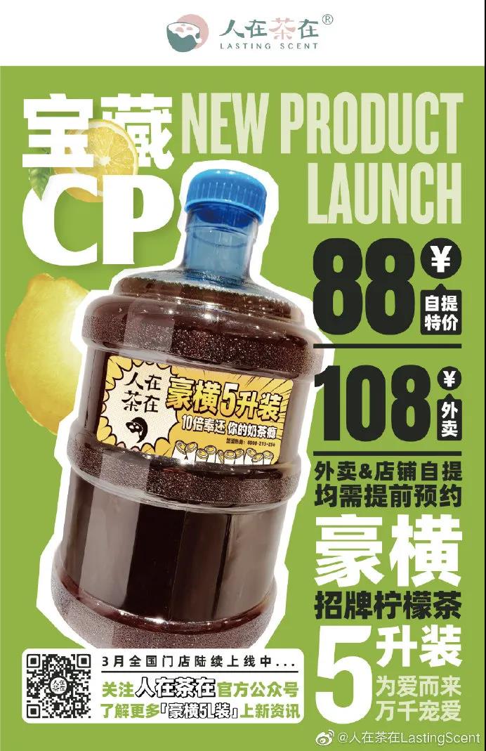 河豚还为我们举了个现成的栗子,也就是前两天的白色情人节。人在茶在新出了一款5升桶装柠檬茶,和之前的珍珠奶茶组成了一对豪横CP。之所以会有这么一款产品,是因为顺应了老顾客的呼声,柠檬茶是人在茶在的一个招牌,老顾客颇为熟悉。