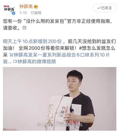 同时,配合营销话题,钟薛高缩短营和销的转化路径,直接将营转化为销售力。钟薛高为此次活动全网准备2000份发呆包,7.12前每日限量100份,7.16前每日限量200份,开启发呆包限量抢购模式。