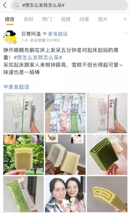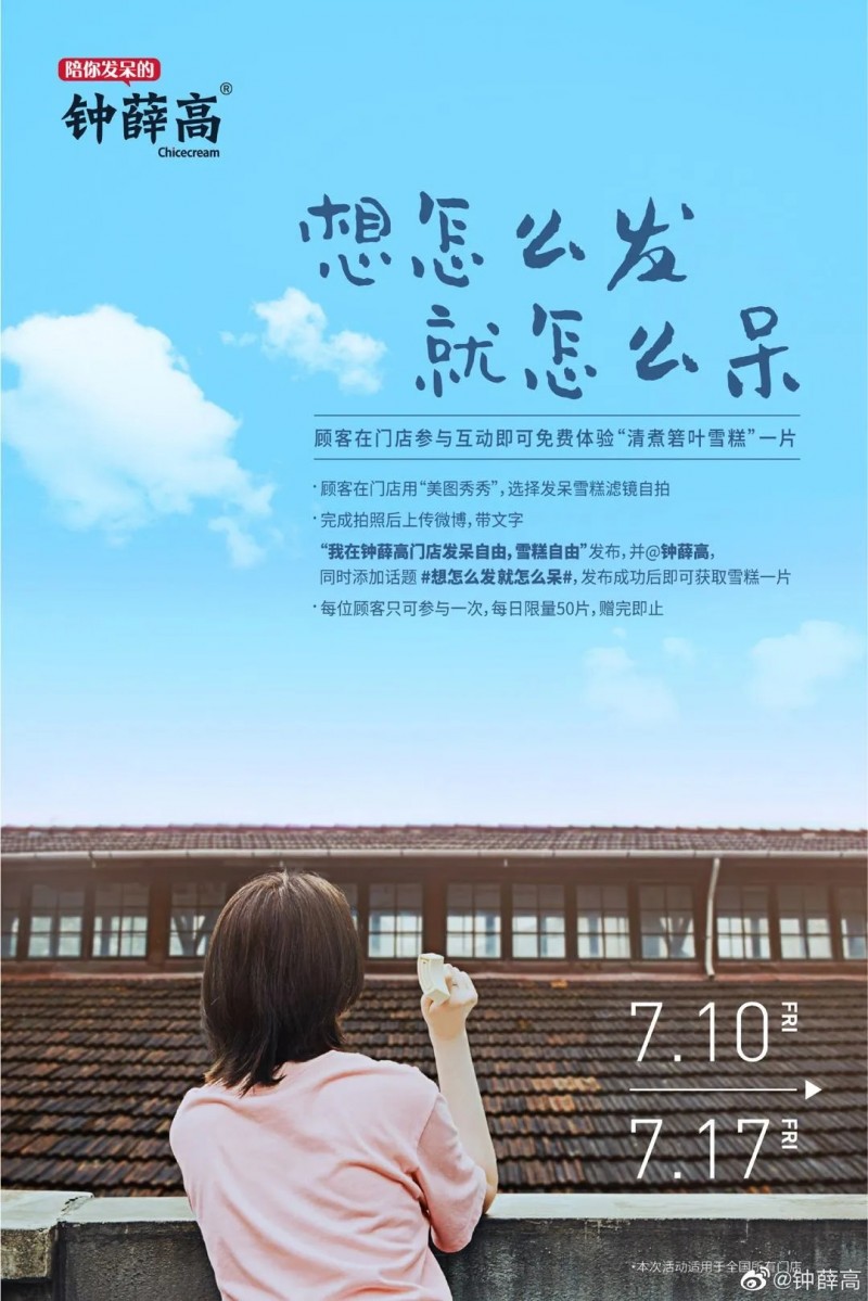 具体来说,就是在门店用美图秀秀选择发呆雪糕滤镜自拍,完成拍照后上传微博,带文字“我在钟薛高门店发呆自由,雪糕自由”发布,并@钟薛高,同时添加话题#想怎么发就怎么呆#,就算成功参与。