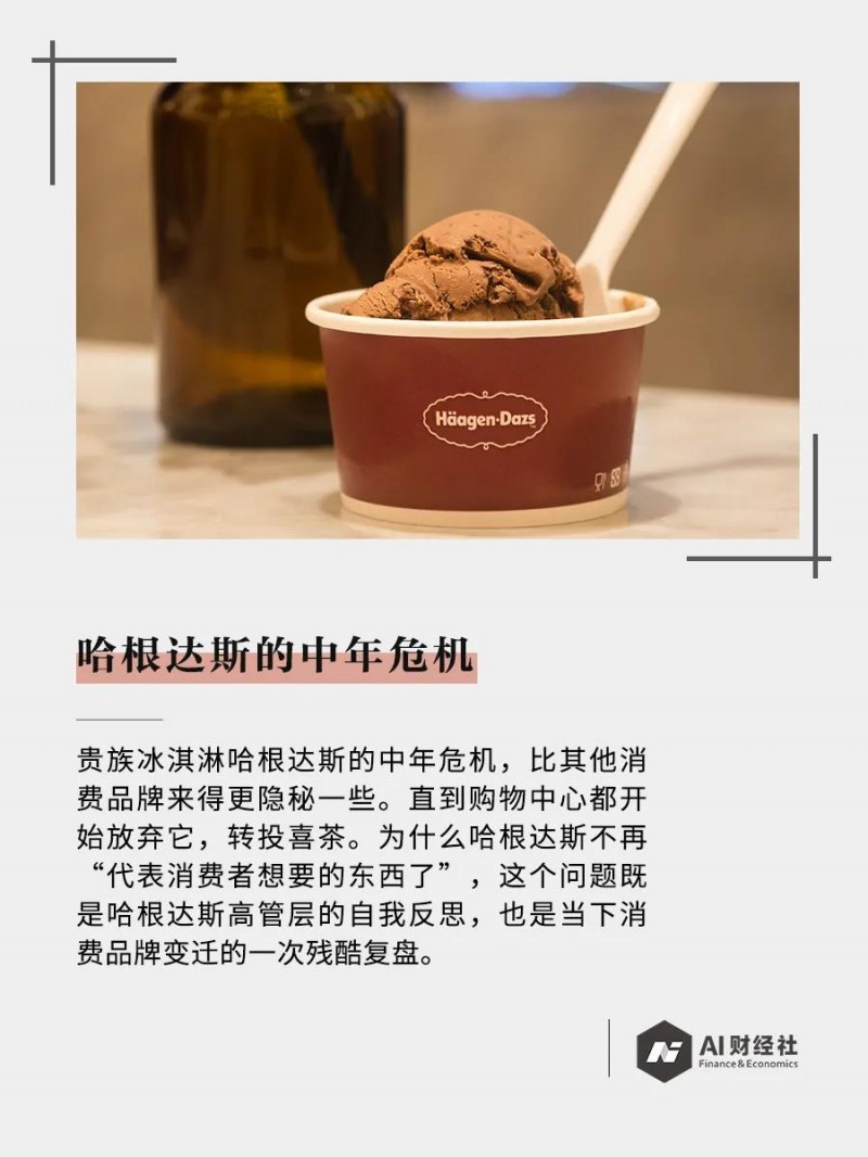 80后广告从业人士小叶告诉AI财经社,在大学的广告学课堂上,哈根达斯是作为经典案例出现的。七八年前初入职场时,她眼中的哈根达斯还带着光环;但如今,这个品牌成了她口中的“一般般”。
