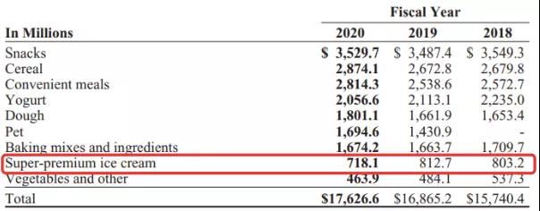 通用磨坊2020财年的财报数据显示,截至2020年5月31日,哈根达斯在全球 90 个国家拥有 840 多家门店,超高端冰淇淋Super-premium ice cream的销售从2018财年的8.03亿美元,降低到2020财年的7.18亿美元。