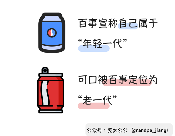 当百事宣称自己是“年轻一代”才喝的东西时,就是给可口可乐按上了“老旧、过时、落伍“”的定位……