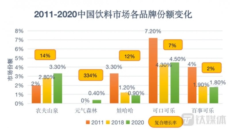 相比之下,农夫山泉复合增长率为14%,可口可乐、百事可乐两大国际巨头复合增长率分别为7%和2%。