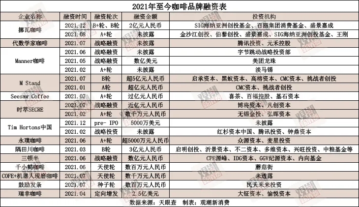 还可以明显看到,2020年,资本对咖啡市场的关注度主要集中在线上品牌,2021年则是集中在线下连锁精品咖啡。