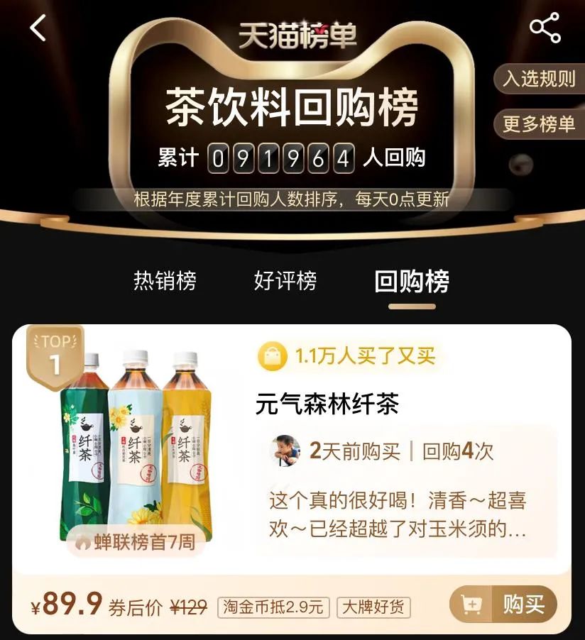 农历新年以来,作为无糖茶饮之一的元气森林纤茶在天猫表现不俗。截至2月24日,元气森林纤茶已经蝉联天猫茶饮料回购榜榜首7周(该榜单是根据年度累计回购人数排序、每日0点更新)。今日,它还占据了茶饮料热销榜第一(该榜单是综合商品近7日销量与成交金额排序、每日0点更新)以及茶饮料好评榜第五(该榜单根据商品近30日四五星好评率排序,每天0点更新)。