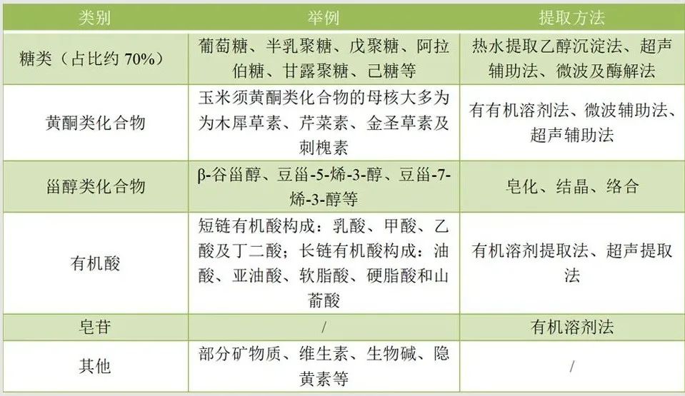 注:玉米须的产地、品种、采收时间均会影响其活性成分的含量
