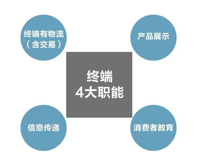 终端有物流(含交易)、产品展示、信息传递、消费者教育四大职能,终端的形式可以千变万化,但终端的这些职能必须存在。