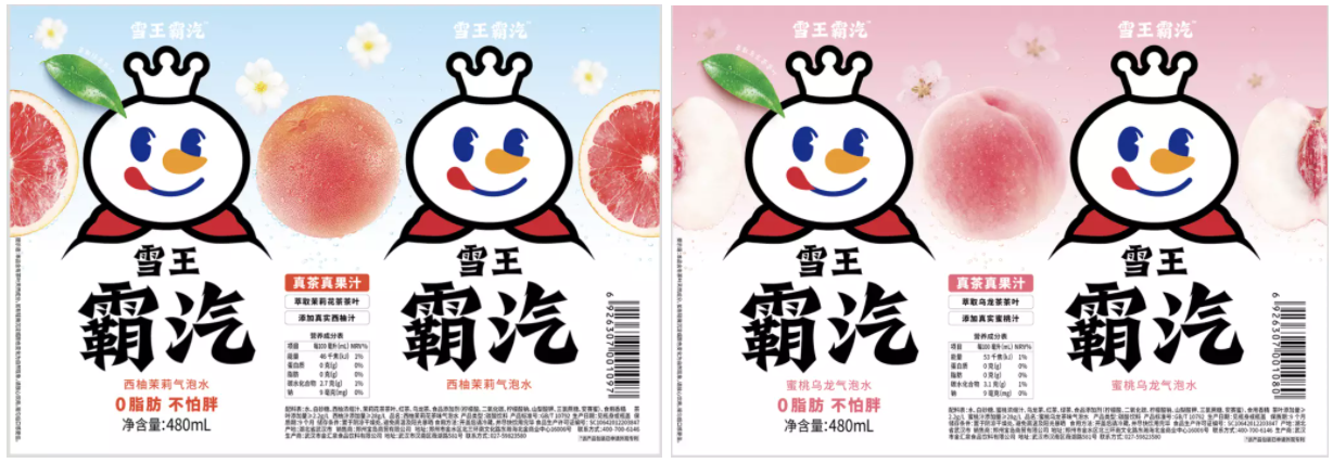 拟在A股市场IPO的蜜雪冰城,动静就比较大了,此前申请注册了“雪王爱喝水”商标、瓶子外观专利;还于2021年8月成立重庆雪王农业有限公司,经营范围包含饮料生产;近日显示申请的“瓶贴(霸汽系列)”外观专利已获授权,涉及蜜桃乌龙气泡水、西柚茉莉气泡水两款产品,瓶贴上贴着“0脂肪不怕胖”等字样。