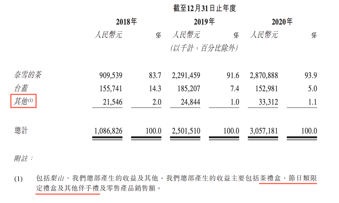 待到奈雪做了瓶装饮料一年多后,后者的存在感才强了一些,但谈不上地位有多高。从奈雪的2021年中期报、年报中,可窥见一二。瓶装饮料依然属于“伴手礼及零售产品”大类,但出现在了“其他”的备注中。