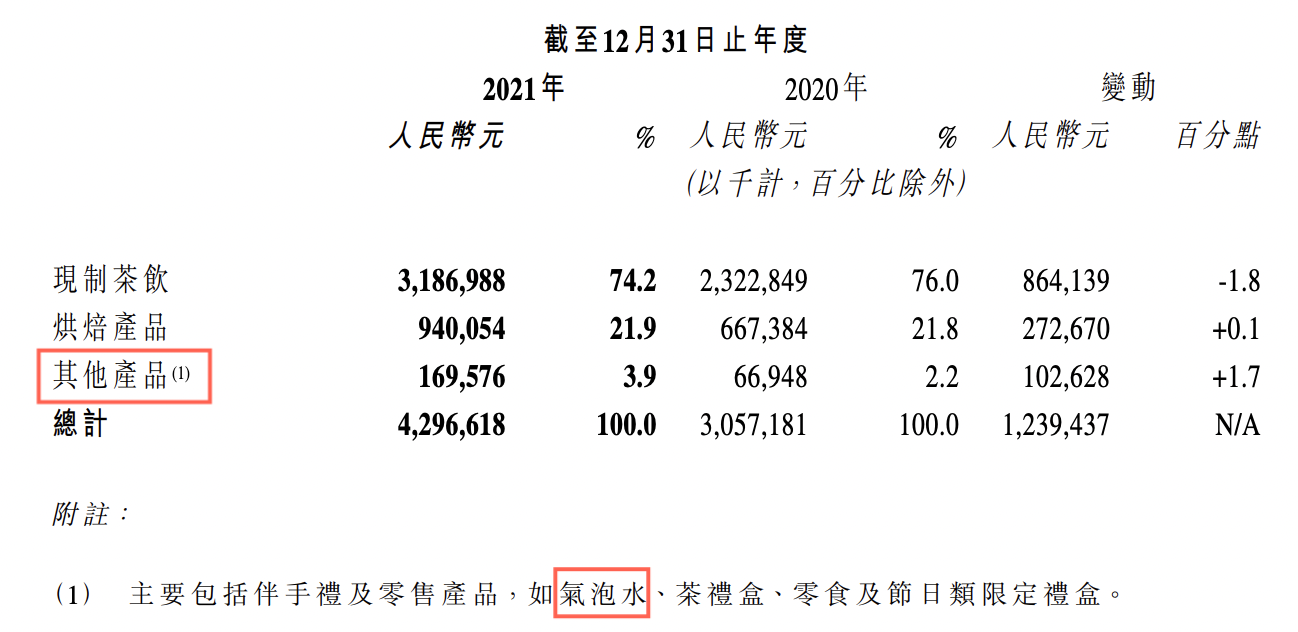只是,奈雪的瓶装饮料一直没能掀起太大水花。在它的2021年财报中,包括气泡水、茶礼盒、伴手礼这些在内的“其他产品”营收1.7亿元,营收占比3.9%,规模并不大。而“气泡水”在这份年报中只露面了这一次。到此时,奈雪已经做了整整两年瓶装饮料。