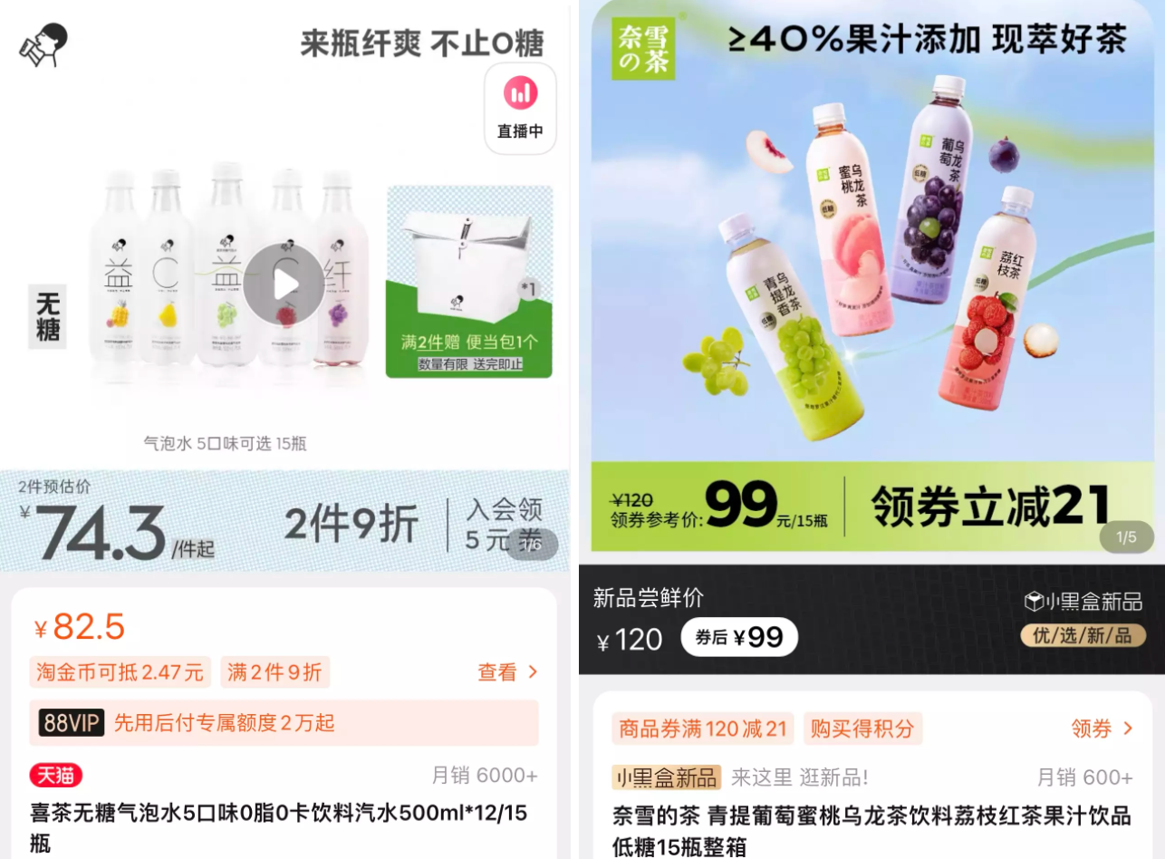在茶饮选手们的蓝图里,中国暂未形成规模化的高端饮料市场。开菠萝财经对比喜茶、奈雪在网店的售价发现,它们销售较好的产品,单瓶价格在5.5元到7元之间,比元气森林稍高。