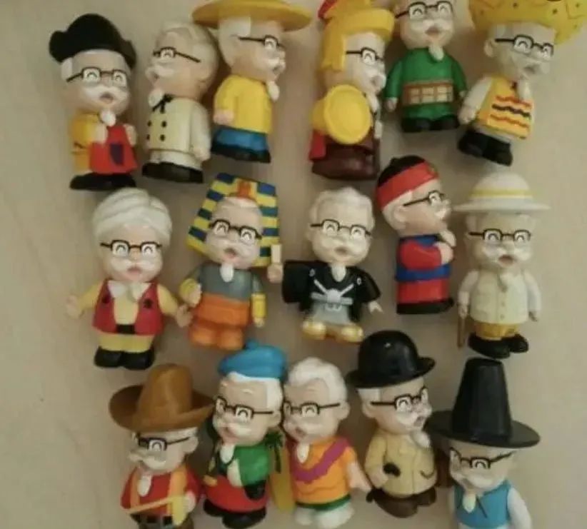 肯德基这边就冷清许多,一个叫山德士上校的老头,带着一只叫奇奇的公鸡,撑起早期肯德基玩具造型半壁江山。