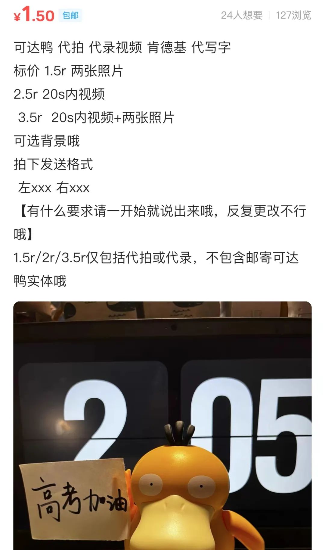可达鸭已经脱离玩具的初级形态,进化为一种传递信息的媒介,它们呆若木鸡、目空一切,所以可以用来抒发任何情感。肯德基提供的免费玩具有限,围绕可达鸭的生意也做起来了。除了打不死的黄牛们前仆后继地炒货之外,有人发现人们不一定非要把可达鸭弄到手,主要是想看各种创意短视频,催生出“一鸭永逸”的代拍业务,10s生日祝福、上岸鼓励、各式造型摆拍统统可以满足。