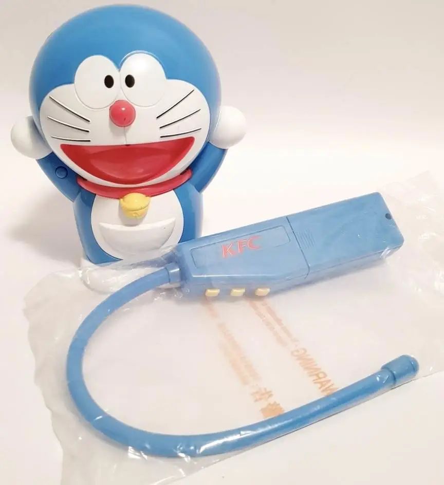 2004年肯德基推出未来长期合作伙伴哆啦A梦的主题玩具,除了卖萌之外,玩具带有录音和遥控功能,除了哆啦A梦玩偶之外,还有一个带着古早科幻片气质的天线遥控器,后来这款玩具被成年人开发成表白神器。