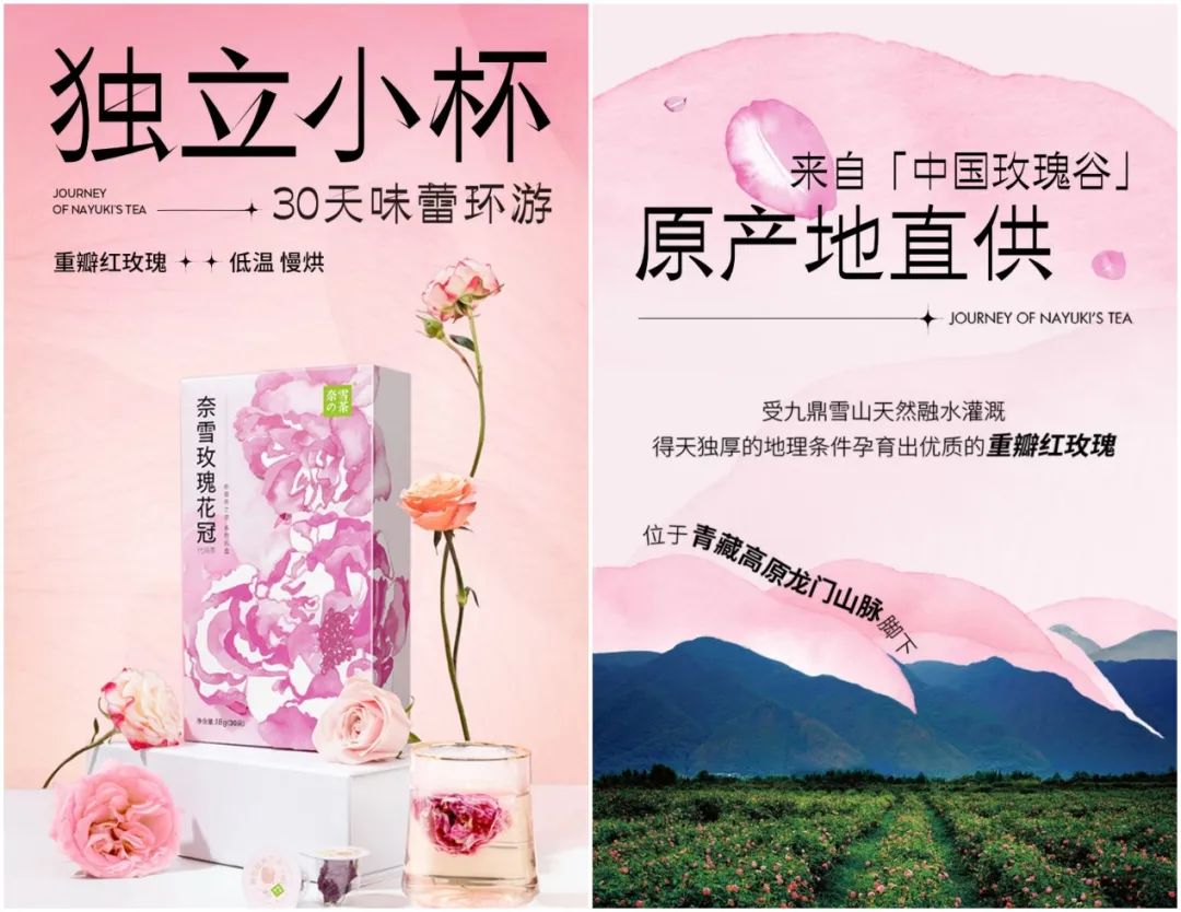 近日,奈雪被上海市场监管局罚款1.58万元。原因正是其在今年1月上架的果饮“霸气黑桑葚”广告宣传中明确标示了“野生甜心”字样,用以表明该果饮中原料(桑葚)的来源。然而结果是,这批原料来源于南京一家农业公司,为产地的农户养殖和采摘。即“霸气黑桑葚”所用桑葚并非野生产品。除了这款不惜“违法”的霸气黑桑葚,奈雪在对众多产品的宣传中,始终放不下对原料原产地的推崇——“新疆小红杏”、潮汕“鸭屎香”茶叶、青藏高原龙门山脚下的“重瓣玫瑰”……时令鲜果、名优茶叶、当季鲜花......“品质”、“优质”成为奈雪修饰“原料”的关键词。“为保证每一朵玫瑰的形态和品质,在清晨8点前,半开的重瓣玫瑰花冠便被手工采摘下来......”