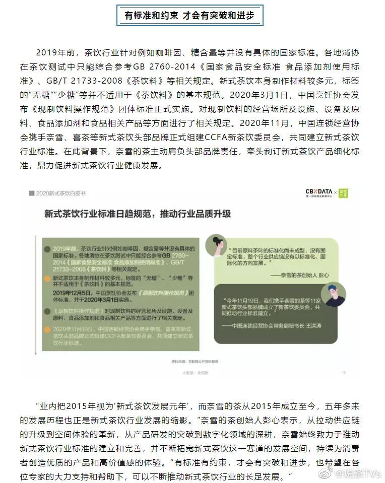 作为一个还算新的行业,新茶饮在刚开始的几年里荒蛮发展是必然。但野蛮生长过后,行业的发展必然需要一套“规则”。于是,作为新茶饮绝对头部的喜茶、奈雪开启了为行业“立规矩”的竞赛。在2020年,喜茶就在中国连锁经营协会(CCFA)主办的“2020中国全零售大会”上提出了两大新茶饮标准:“新茶饮,必须使用天然原材料打造好的产品,必须致力于塑造并传递某种品牌文化。”在更早的2019年,奈雪就开始关注行业标准问题,曾与36氪一起,发布《2019新式茶饮消费白皮书》,共同呼吁尽快制定行业标准。