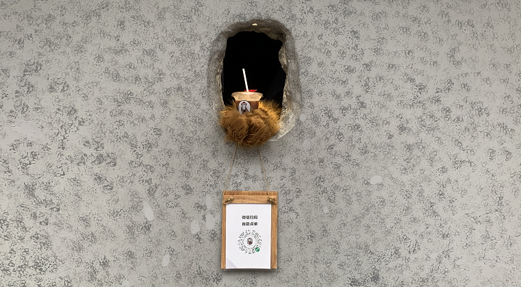 周五下午,熊爪咖啡永康路店临时店长姜智超的工作是担任“爪爪”。在“熊洞”背后,他套上了长长的熊爪手套,不断比划着“yeah”“hello”等手势。身后的操作间里,无声咖啡师菲菲完成了咖啡制作,将咖啡杯或打包袋交到了他的手上,再由他传递给顾客或外卖小哥。