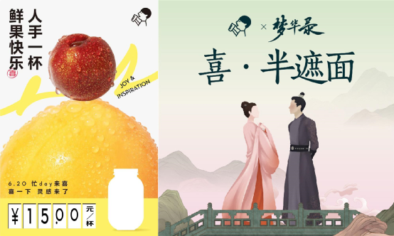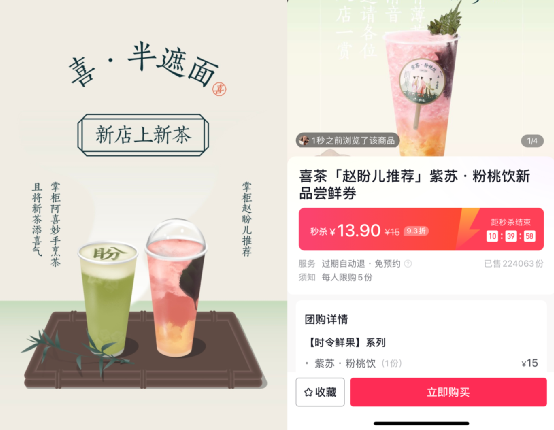 6月20日,喜茶推出多肉桃李果茶新品,产品定价15元,刷新了喜茶今年以来果茶新品最低价。6月30日,喜茶和大热剧《梦华录》推出联名产品紫苏·粉桃饮、梦华茶喜·点茶,分别定价15元和19元,紫苏·粉桃饮抖音团购价更是直接下探至13.9元。