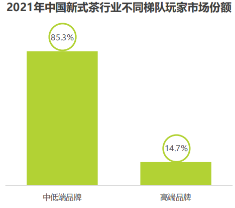 行业人士普遍认为,降价,是喜茶、奈雪大举进入中端市场的重要信号。而二者选择中端市场的原因也很容易理解:中端市场目前仍比高端市场份额高。据艾瑞咨询数据,2021年我国新式茶饮中的高端品牌(即单价高于20元)的市场份额只有14.7%;超过85%的市场份额,被单价20元以下的品牌把持着。