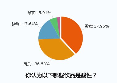 雪碧和可乐都属于碳酸饮料,主要成分有碳酸水和柠檬酸等酸性物质,因此属于酸性饮料,但是只有38%的消费者了解雪碧是酸性饮料,36.53%的人了解可乐是酸性饮料。茶水本是碱性,但是茶饮料因为加入了酸味剂等配料,导致最终的饮品呈酸性,而只有的消费者了解5.91%茶饮料是酸性饮料。脉动属于功能性饮料,脉动以天然果味、微酸、维生素群组合为市场需求,所以也属于酸性,17.64%的消费者了解这一点。