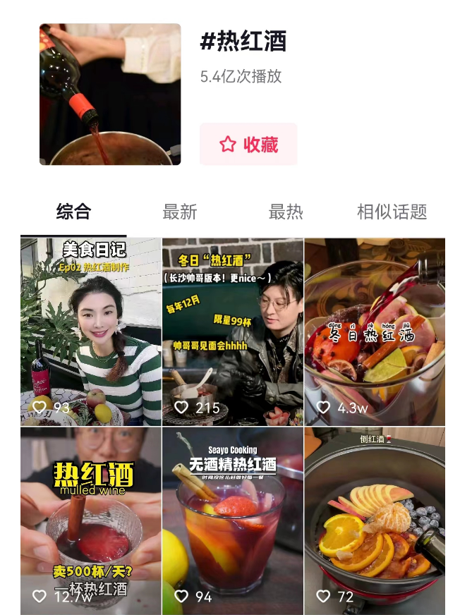 据餐饮O2O搜索发现,抖音#热红酒#话题当下总播放量达5.3亿次,其中不少热门视频都是最新拍摄的。
