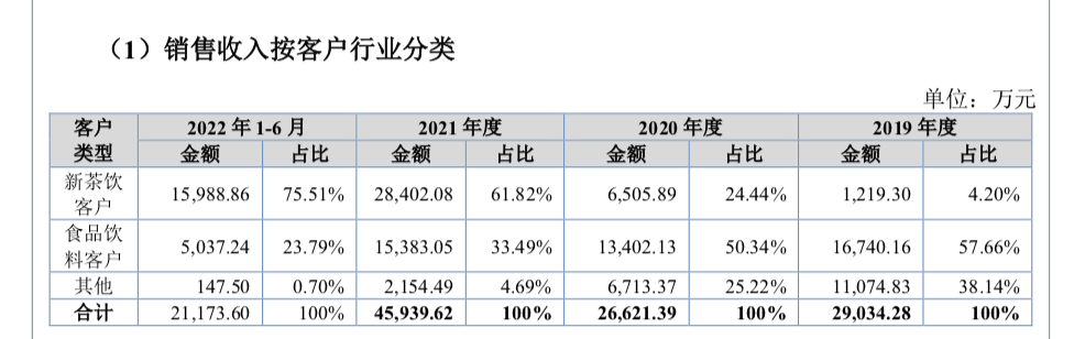 成为新茶饮市场的“熟人”后,田野股份的营收结构也发生了改变,新茶饮客户占比在三年时间里上升明显。2019年至2021年,田野股份新式茶饮客户的收入占比分别为4.2%、24.44%和61.82%;食品饮料客户的收入占比则分别为57.66%、50.34%和33.49%。