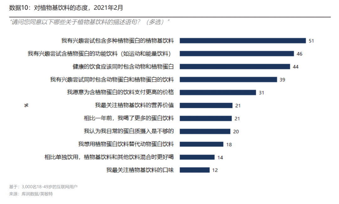 资料显示,在中国市场,消费者对混合了动植物蛋白的饮料有一定兴趣。英敏特2021年发布的报告数据显示,39%被访者“有兴趣尝试同时包含动物蛋白和植物蛋白的饮料”。此外,44%被访者认为“健康的饮食应该同时包含动物和植物蛋白”。