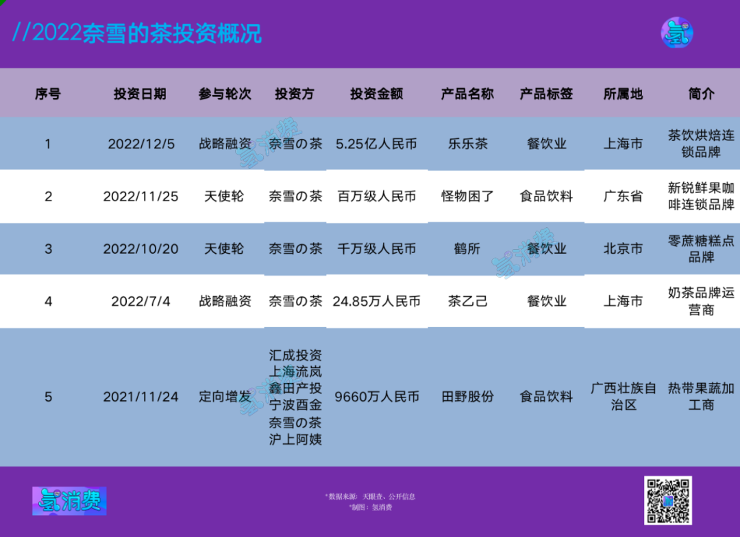 新锐鲜果咖啡连锁品牌“怪物困了”、零蔗糖糕点品牌“鹤所”、奶茶品牌运营商“茶乙己”、热带果蔬加工商“田野股份”,均在奈雪今年的射程范围内。