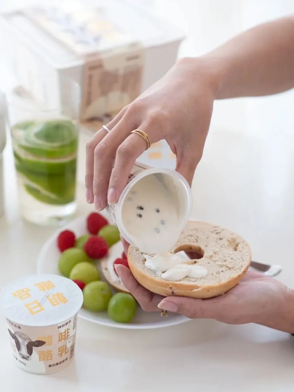 此外,朝日唯品还会围绕「一平米餐桌」的概念,延伸更多用餐场景。比如平时大家爱用奶油涂抹在贝果上,但其实朝日唯品的酪乳也有隐藏的打开方式——它可以在贝果面包上涂抹,也可以用拇指饼干蘸取品尝,品尝起来不仅拥有同等的美味,而且对肠胃而言更没有负担。当酪乳与其他食品搭配,搭建起了更为具体的场景,酪乳不再只是单一而扁平化的食物,而是构成有了氛围感和场景感的生活日常,从而能更深入、更鲜活地扎进消费者的生活里去。